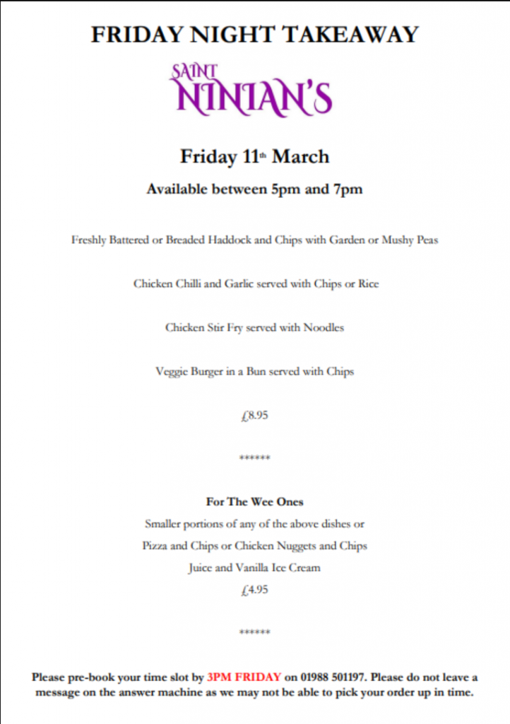 As well as offering carry out for most items on our regular menu during normal opening hours, for much of the year we have an early evening Takeaway Menu on Fridays. If the date on the menu below has passed, then please check our Facebook Page for up-to-date information.